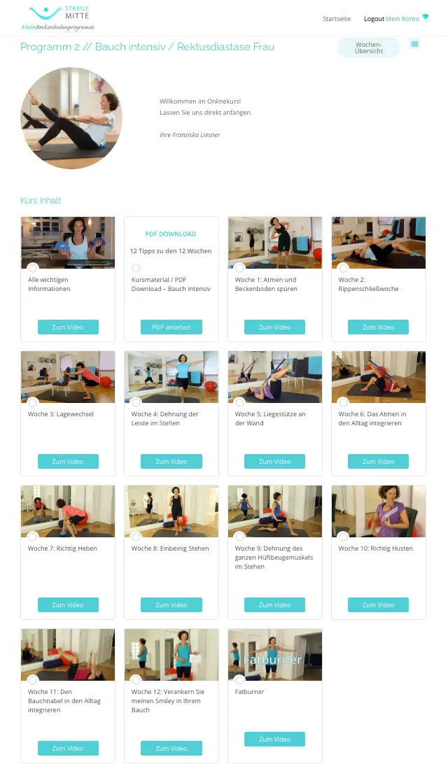 - 12 Videos à ca. 30 Minuten für jede Woche